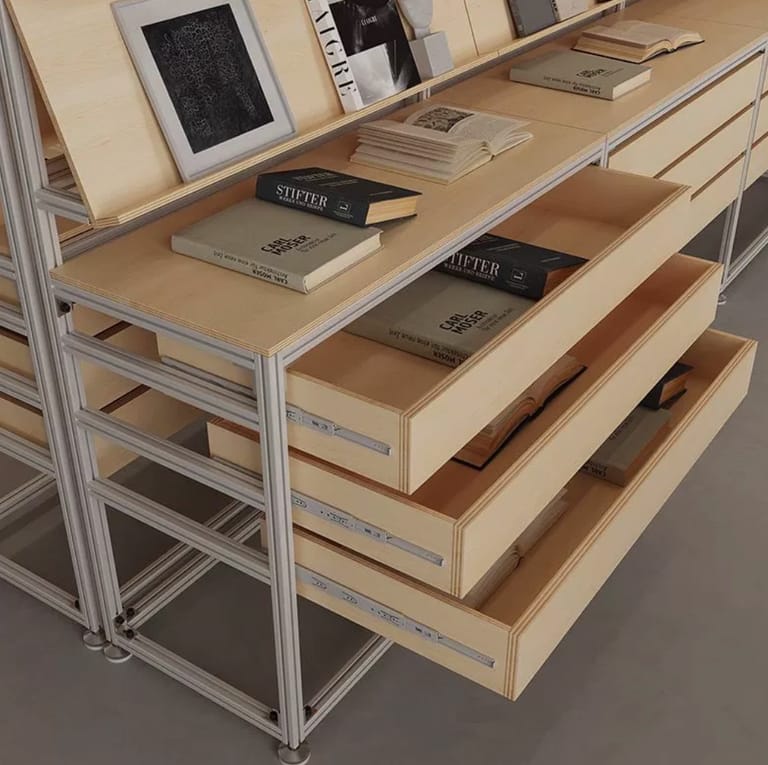 Tailored for bookstores, cultural shops, and stationery boutiques, this aluminum profile display shelving transforms how you present books, magazines, and 文创 products. Its core design combines slanted upper shelves (to highlight book covers / 文创 packaging) with hidden drawer storage (for inventory restocks), all built on a durable, industrial-chic aluminum frame. The modular structure adapts to small corner spaces or large wall-to-wall layouts, making it perfect for both independent bookstores and chain cultural retail spaces – turning messy stacks into a curated, customer-friendly display.