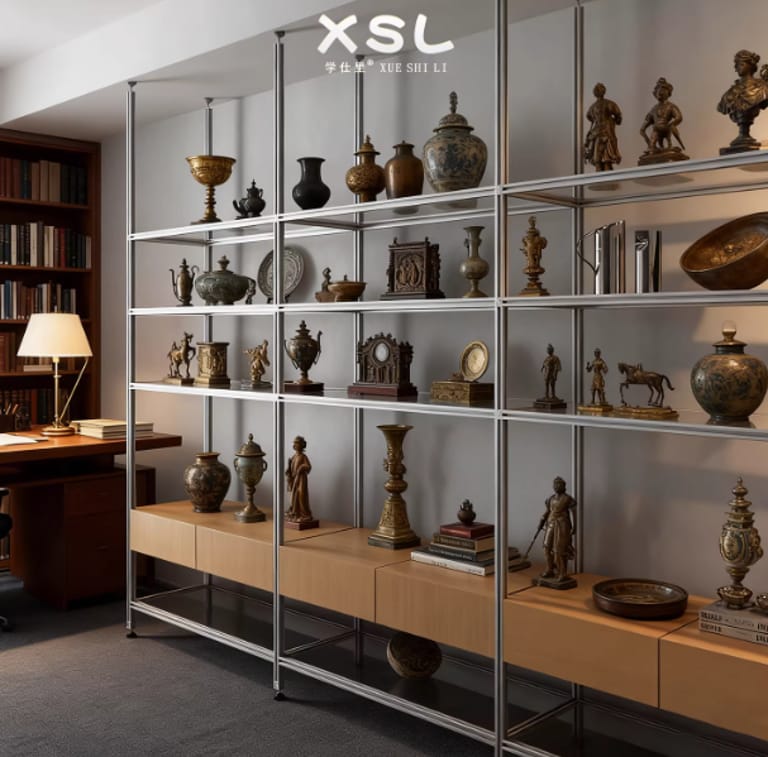 For collectors of Chinese cultural heritage, this display shelving system is more than storage – it’s a stage for your treasures. Crafted to complement the elegance of blue-and-white porcelain vases, intricate bronze artifacts, delicate jade carvings and rolled calligraphy scrolls, it balances industrial-chic 304 stainless steel framing with warm solid wood bases. The open, modular design ensures each piece takes center stage (without overshadowing its cultural detail) while offering the durability to protect heirlooms for years. Whether in a luxury living room, private study or small cultural gallery, it turns a collection into a curated exhibition.